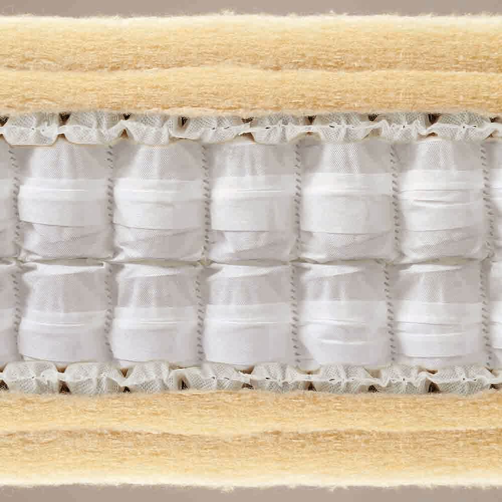 ReActivePro™ DUO pocket springs consist of a double layer of pocket springs designed to meet Hypnos’ softer comfort requirements, with perimeter frames and 3 rows of firmer tension springs at the edge for support. Each spring is at least 5 turns, so combined are over 10 turns and are lighter-weight springs. Each spring layer engages separately, depending on weight and size, providing a graduated feel and cushioned support.