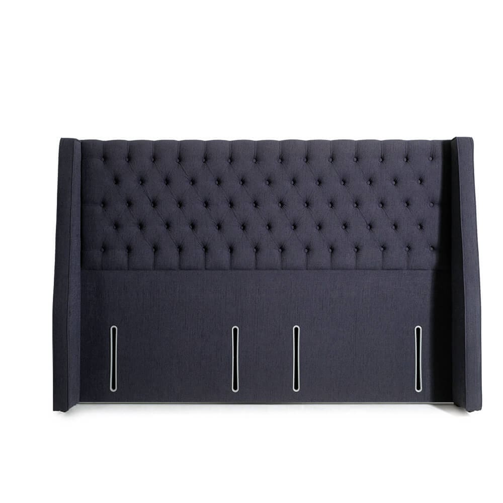 A deeply-buttoned and exquisite, winged euro-wide headboard. The side wings, with piped detail, wrap around the head of the bed to provide a real design statement.