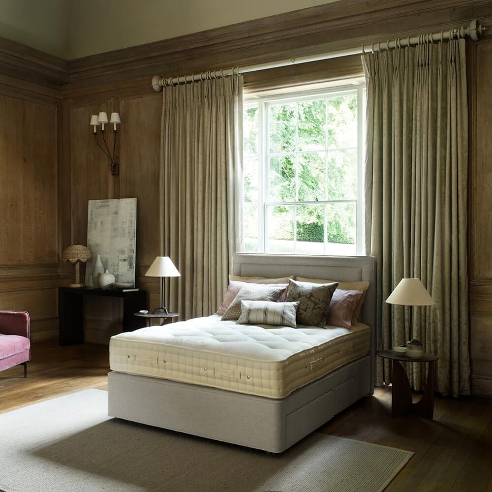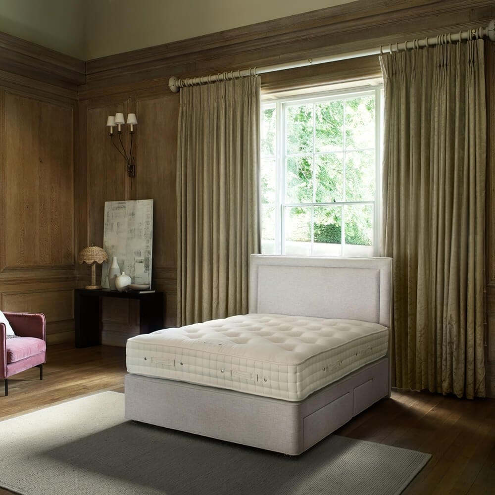 Within the mattress are 1200 ReActive Pro 6 turn pocket springs, giving a luxurious feel and edge-to-edge support. Upholstered with a naturally soft and breathable Swaledale wool pad and just over 8 fleeces of 100% wool.