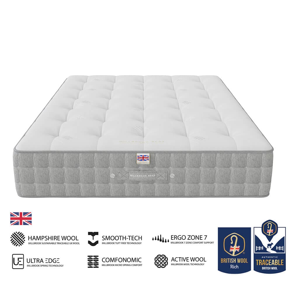 This mattress includes 1000 ErgoZone7 pocket springs and 3000 Comfonomic micro springs. Millbrook’s Ultra Edge border technology ensures consistent edge-to-edge support.