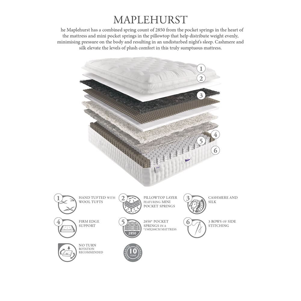 Experience unparalleled luxury with the Maplehurst mattress, featuring dual layers of cashmere and silk for superior cushioning. Its innovative mini pocket comfort layer enhances pressure relief while providing steadfast support, ensuring both lasting durability and unmatched comfort. Discover the perfect blend of traditional craftsmanship and modern innovation with the Maplehurst
