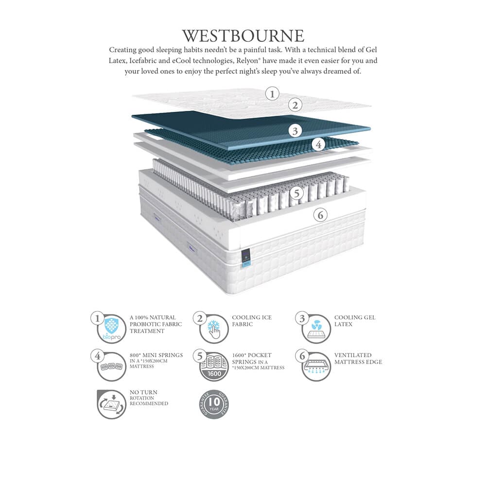 The Westbourne represents Relyon’s innovative approach to enhancing sleep quality. It incorporates advanced, space-age materials uniquely engineered for optimal airflow and comfort. The core feature, Gel Latex, offers exceptional support and responsiveness. Complemented by technologies such as Icefabric and eCool, the mattress promotes enhanced breathability, making it one of the most advanced on the market. With the Westbourne, Relyon continues to redefine industry standards, focusing on a breathable, supportive sleeping experience.