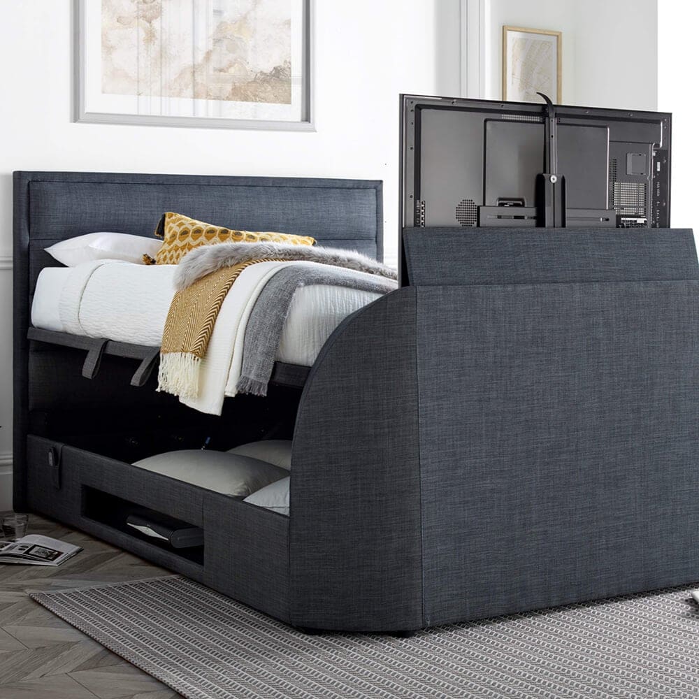 The Salvador TV Ottoman encapsulates modern design with its slim border and horizontal stitch padded headend, offering a sleek and contemporary look for any bedroom. The bed’s design includes a slim footend that ingeniously conceals up to a 43″ TV, seamlessly integrating entertainment into your personal space without sacrificing style or comfort.