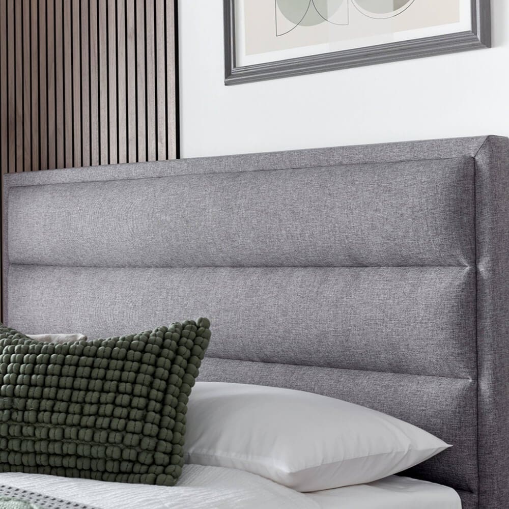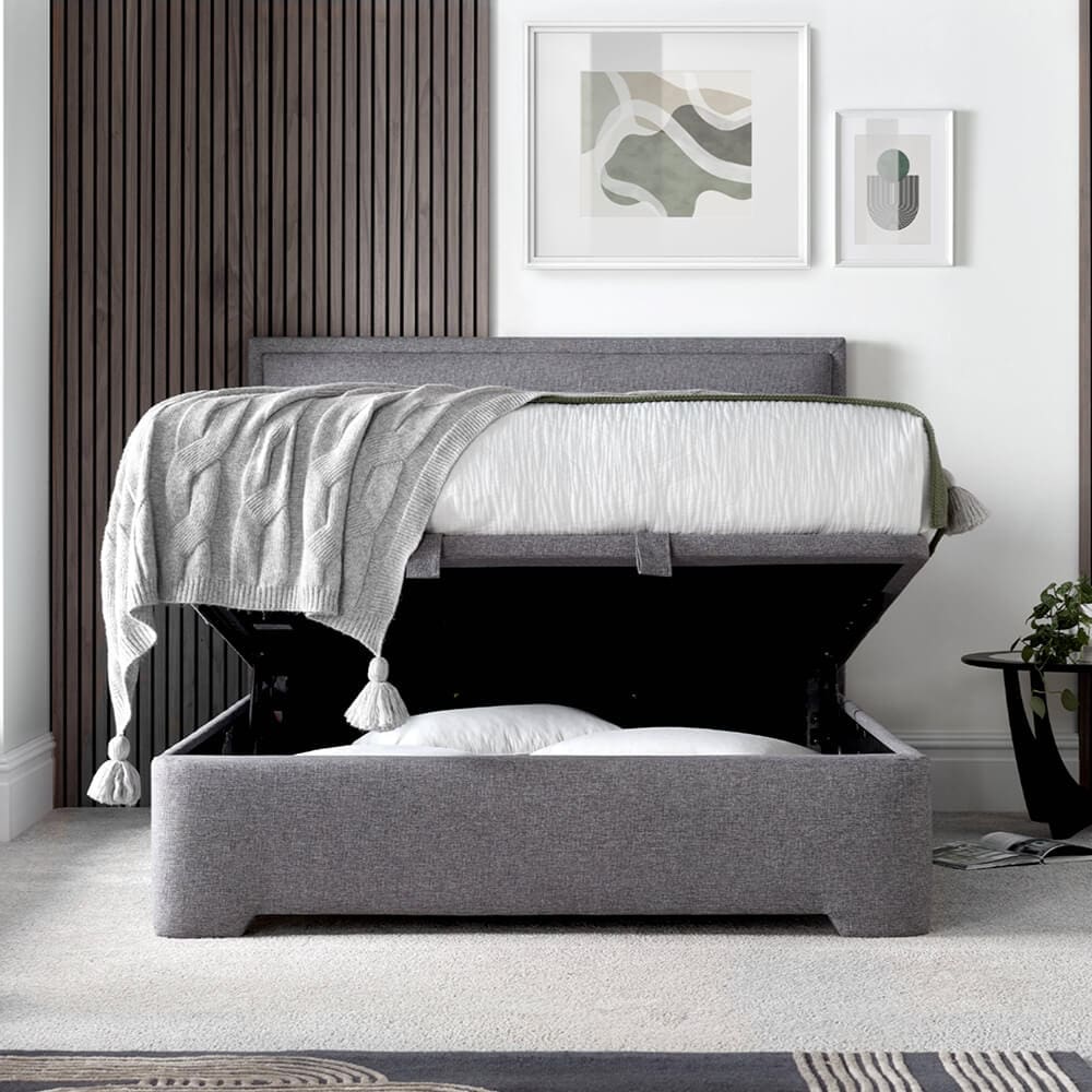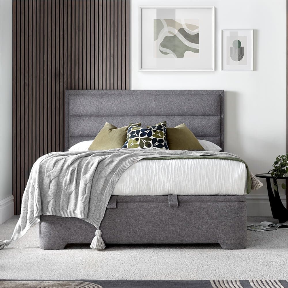 The Toronto bed blends sleek, modern design with practical functionality. Its slim border padded headend and hidden ottoman storage space reflect a thoughtful approach to design, complemented by a ventilated base for mattress care.