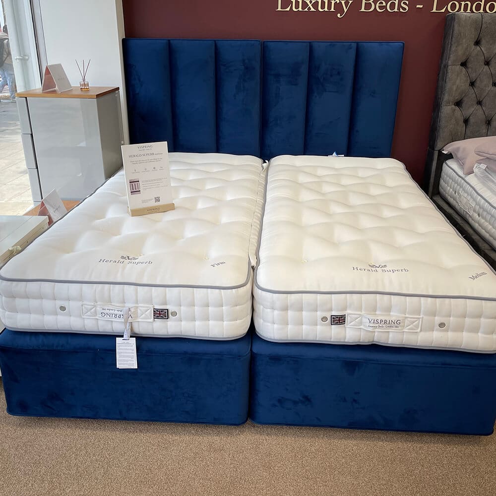 Vispring Herald Superb Zip & Link Divan Set With 2x Ceto Headboard Ex Display – Medium / Firm Tension – Fabric: Plush 2115 Royal